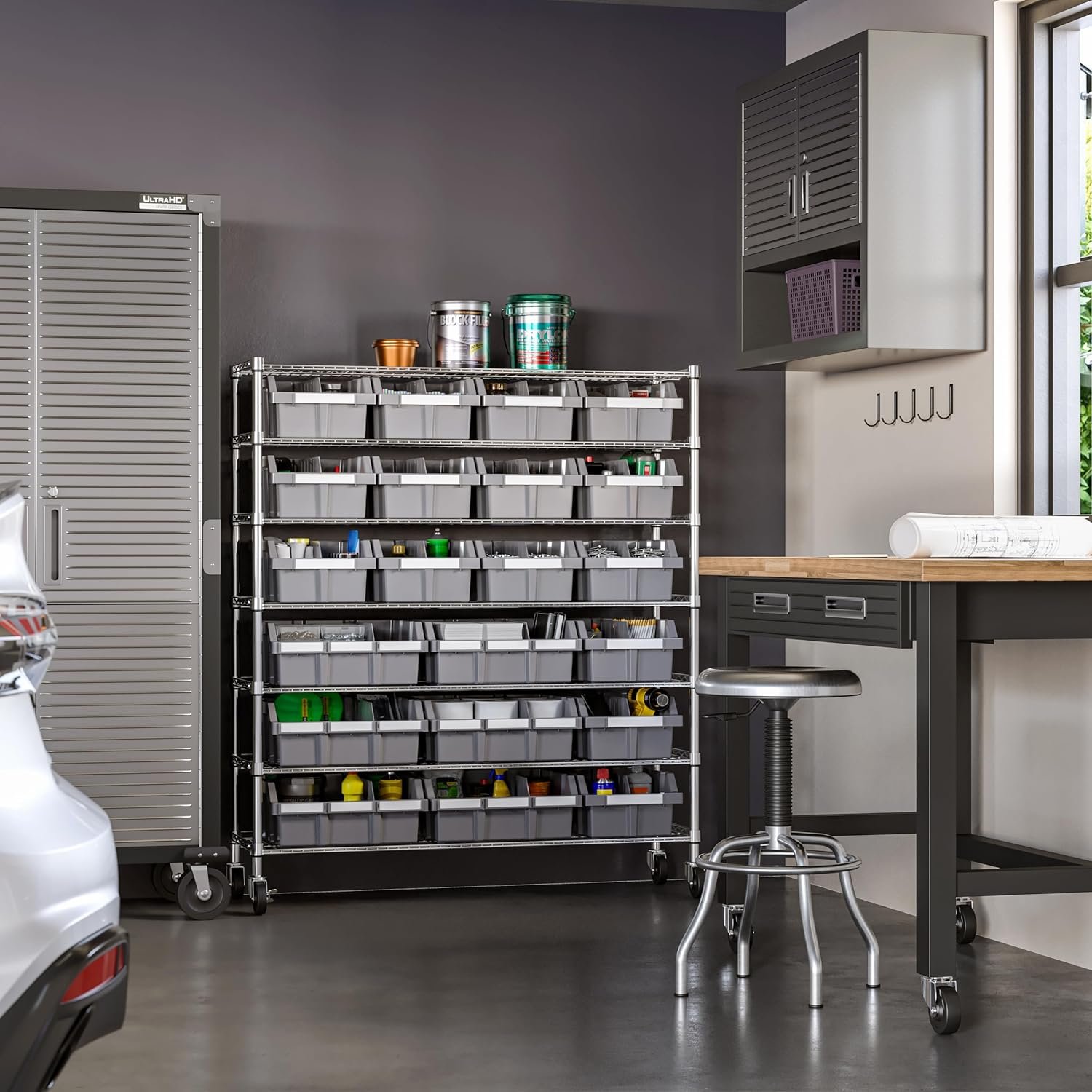 The Seville Classics Heavy Duty NSF Bin Rack is a top-tier storage solution perfect for garages, warehouses, offices, and more. With seven sturdy steel wire shelves and 21 removable, eco-friendly bins, this organizer maximizes space and efficiency. Its patented tilt-locking bin design, 800 lb. weight capacity, and mobile, NSF-certified construction make it both versatile and durable. Choose this Seville Classics storage system for commercial-grade organization that adapts to your needs.